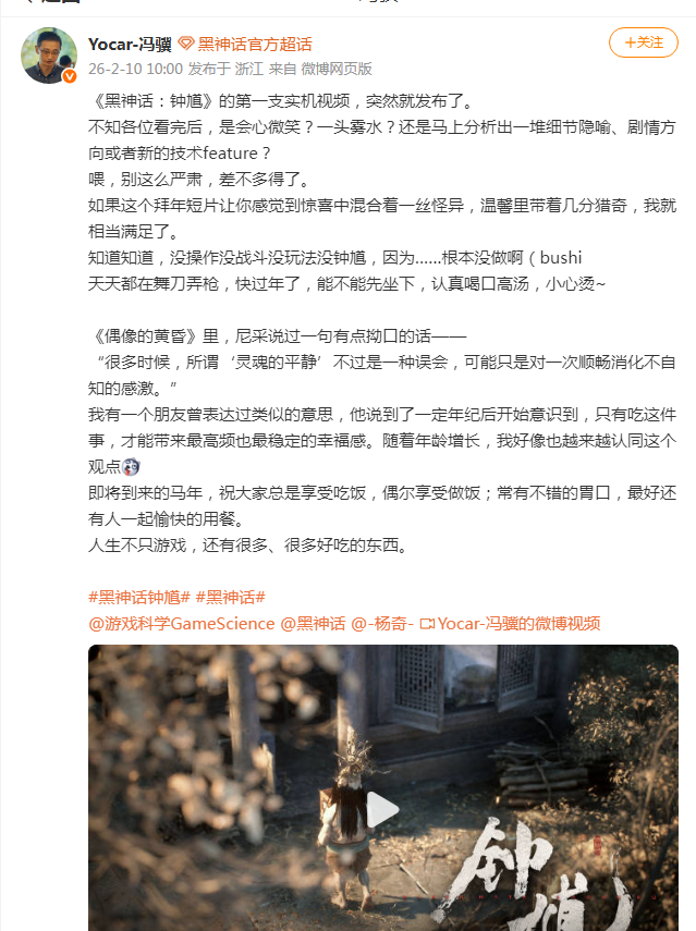 游戏科学CEO冯骥表示:人生不只游戏,还有很多好吃的东西。