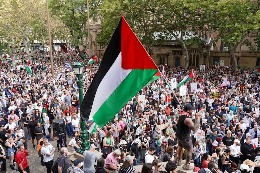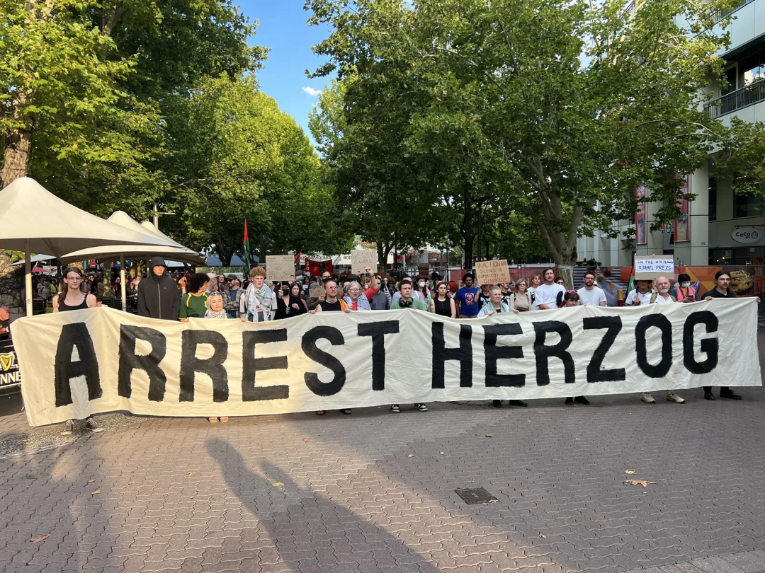 约有上万人参与了在悉尼市中心举行的游行,他们进行演讲,挥舞巴勒斯坦的国旗,并打出“停止战争犯罪”“赶走Herzog”等标语。