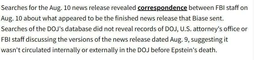 后来有负责任的媒体对司法部的数据库进行了搜索,结果是没有发现任何工作人员谈论9号这份“预先声明”的记录。这表明在爱泼斯坦死前,该声明并未在司法部内外流传过。