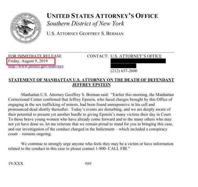 纽约检察官办公室在8月9日就已经写好了两份爱泼斯坦的死亡声明。