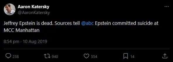 当天,全世界第一个报道爱泼斯坦死讯的媒体是ABC。8点54分,ABC新闻记者Aaron Katersky发推称爱泼斯坦已死;又5分钟后,ABC才进行了全面报道。