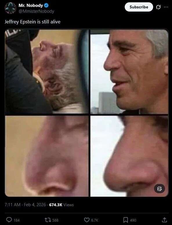 本以为“爱泼斯坦的死有蹊跷”已经是极限了,没想到随着爱泼斯坦文件的释出,他到底死没死都成了一件令人怀疑的事。再加上现在AI制图已足以以假乱真,辨别真伪就更难了。