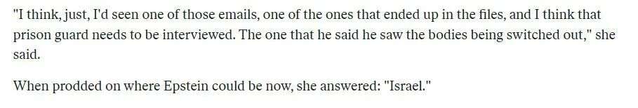 “我记得,我好像看过一些邮件,就是最后被封进档案里的其中一封邮件。我认为那个狱警应该被讯问,就是那个说自己看到爱泼斯坦尸体被掉包的狱警。”