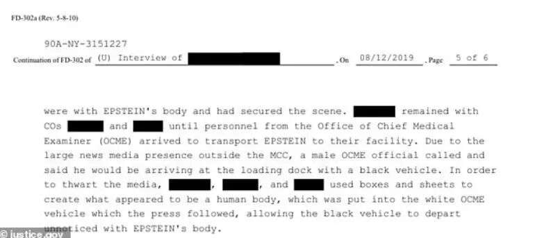 文件的主视角是一名监狱主管,他对FBI透露,其实那天搬运爱泼斯坦尸体时,他们造了假。