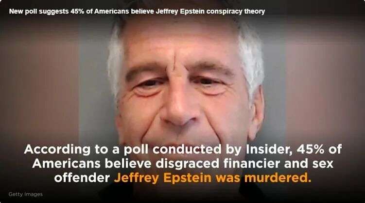 以上三点其实只是冰山一角,真实的疑点要比这更多,爱泼斯坦死后,有媒体做了民意调查,结果只有16%的人相信他是自杀,39%不确定,45%都认为他死于谋杀。