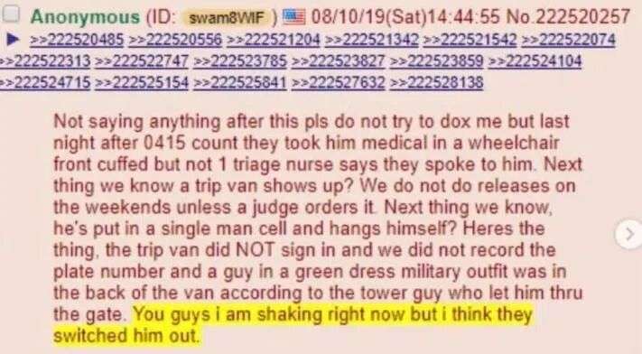 当天4Chan就炸锅了,许多人说的煞有介事,说自己是爱泼斯坦的医生,是狱警......