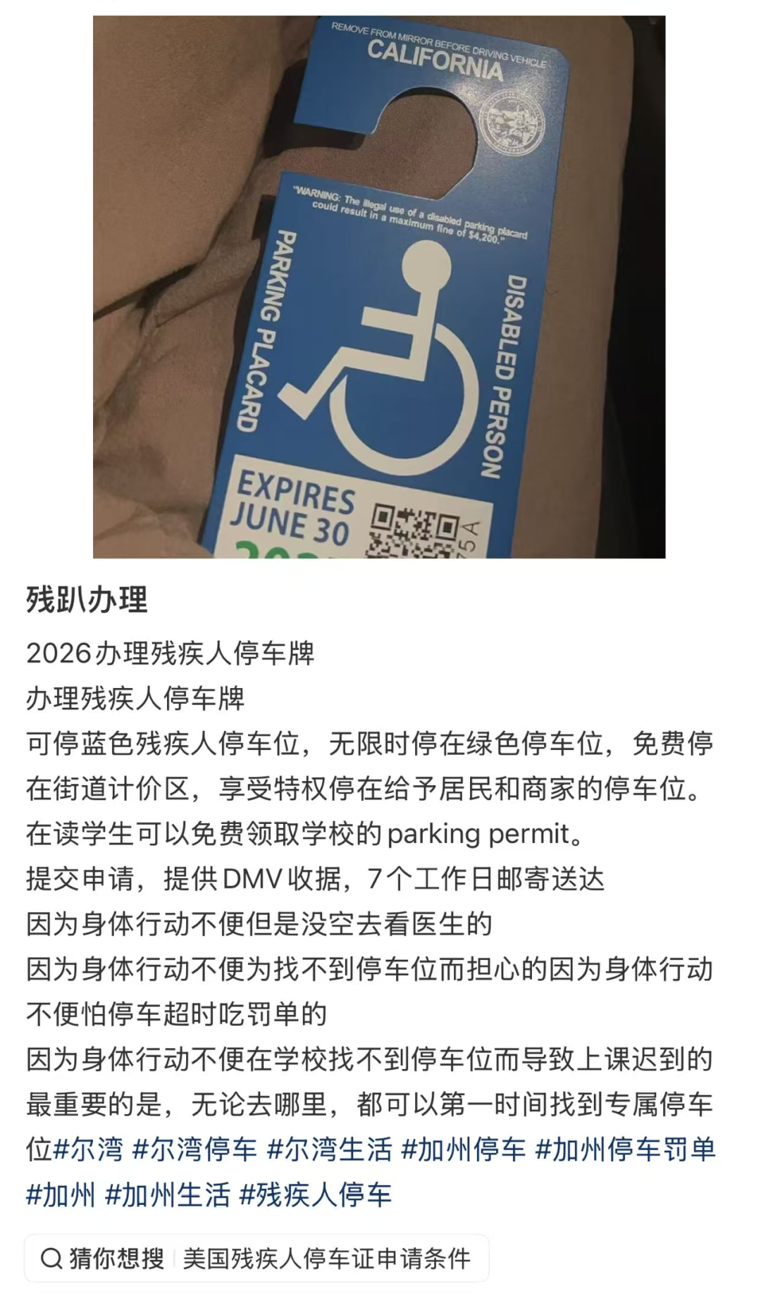 在华人社交媒体小红书上,关于办理加州残疾人停车证的广告比比皆是。律师提醒,办理残疾人停车证务必遵守法律,切勿相信不良中介提交虚假材料,否则面临严重后果。
