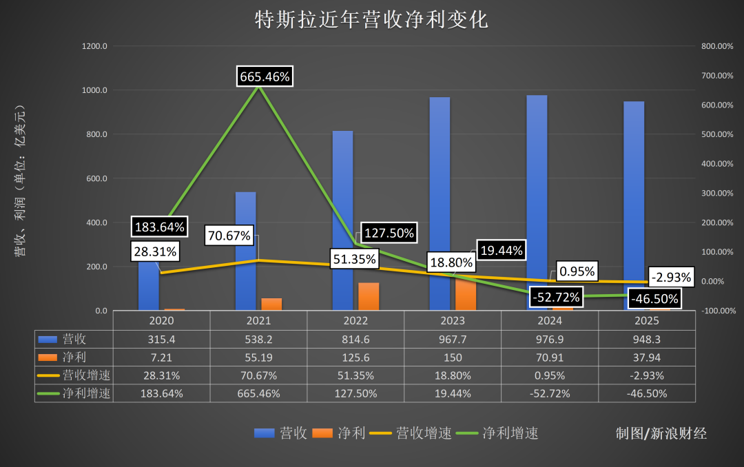 就在不久前,特斯拉刚刚交出了一份糟糕的2025年成绩单。从财务情况上来看,2025年特斯拉总营收948.3亿美元,同比下降2.93%,这是特斯拉近年来首次出现年度营收下滑;全年净利润仅37.94亿美元,相比2024年大幅缩水46.5%,几乎腰斩。