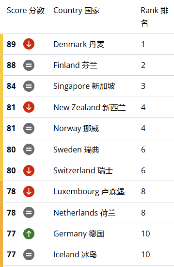 新西兰与挪威并列全球第4位,仅次于丹麦、芬兰和新加坡。