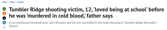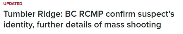 加拿大BC省东北部小镇Tumbler Ridge本周二(2月10日)发生一起大规模校园枪击案,造成9人死亡(包括枪手),另有约27人受伤。其中多数受害者年龄不足15岁。