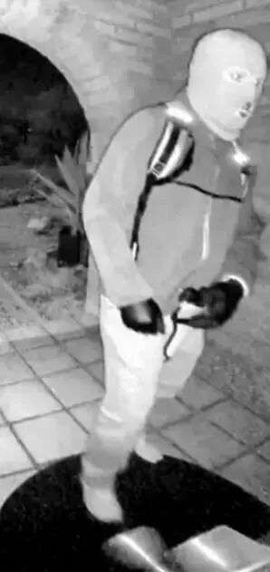 视频中,一名男子出现在南希家门前的小门廊区域。他身穿深色衣物,头戴滑雪面罩,脸部完全遮挡,仅露出眼部区域。