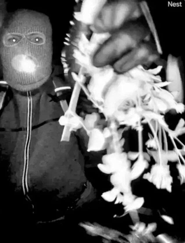 接着,他弯腰从地上捡起门廊旁的植物或装饰性枝叶,将其举到镜头前,试图遮挡视线。遮挡未完全成功后,他又用戴着手套的拳头直接贴近镜头,短暂完全挡住画面。
