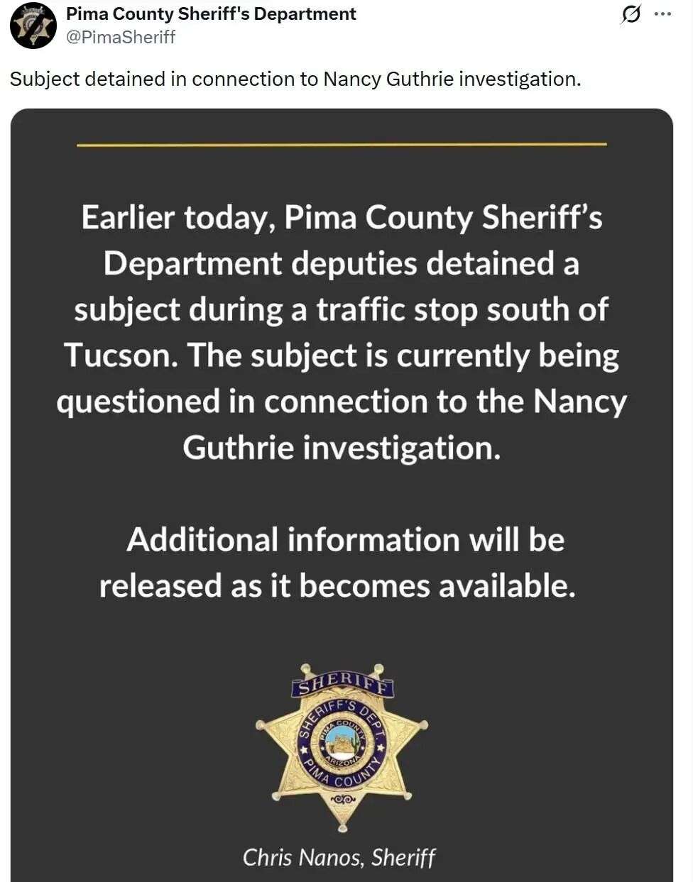 皮马县警长办公室宣布:一名男子在图森以南、美墨边境的一次交通拦停中被拘留,并被认定为“person of interest”(关键关注对象)。