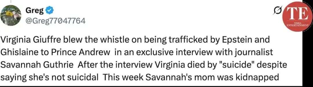 “弗吉尼亚·朱弗里在与记者萨凡纳·格思里的独家采访中揭露,自己曾被爱泼斯坦和吉丝兰贩运给安德鲁王子。后来,弗吉尼亚据称‘自杀’身亡,尽管她曾表示自己并没有自杀倾向。本周,萨凡纳的母亲被绑架了。”