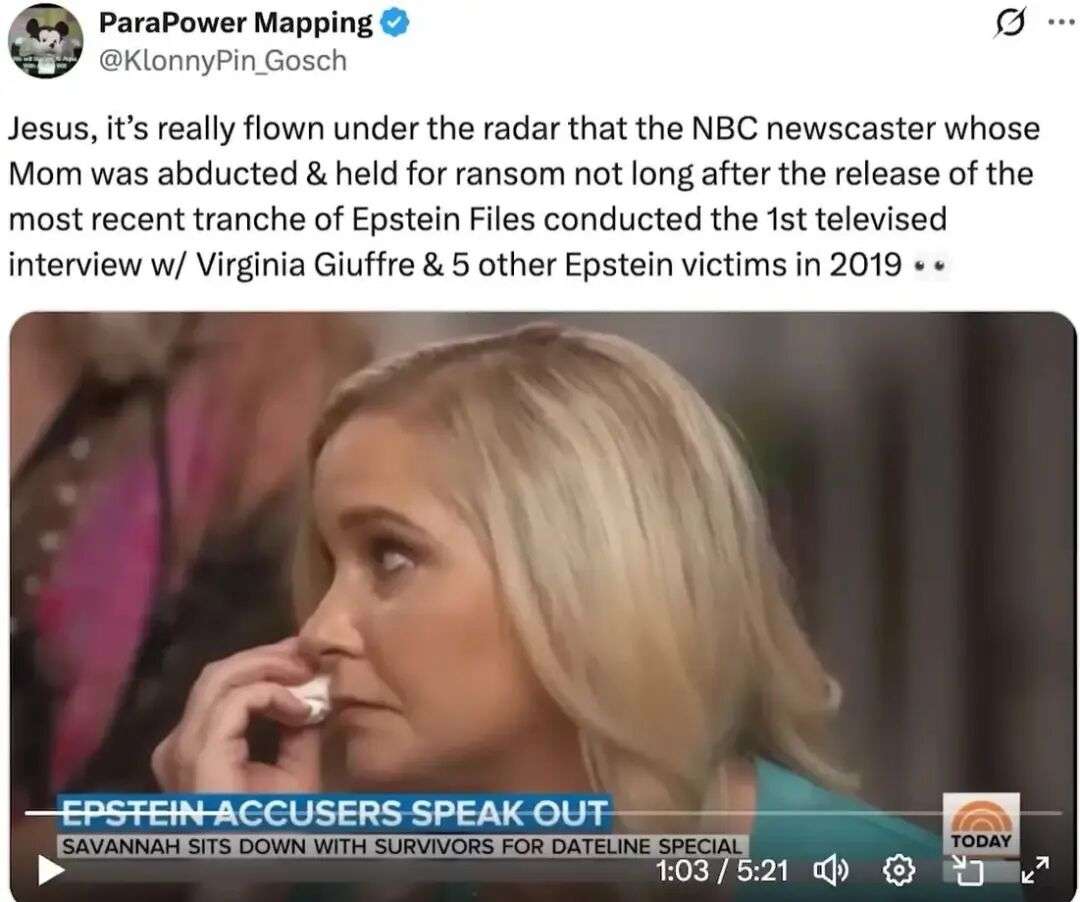 推特上对此议论纷纷:“天啊,这件事竟然几乎没有人注意到——就在最新一批爱泼斯坦文件公布后不久,那位NBC新闻主播的母亲就被绑架并被索要赎金,而这位主播在2019年曾主持对弗吉尼亚·朱弗里以及另外五名爱泼斯坦受害者的首次电视专访 。”