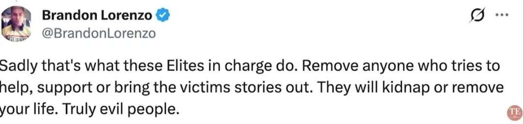“可悲的是,这就是那些掌权精英的做法。他们会清除任何试图帮助、支持或揭露受害者故事的人。他们会绑架你,甚至让你消失。真是邪恶的人。”