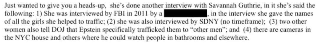 另一封则写道:“她又和萨凡纳·格思里做了一次采访,他们计划在《今日秀》和‘Dateline(NBC特别调查节目)’播出。”