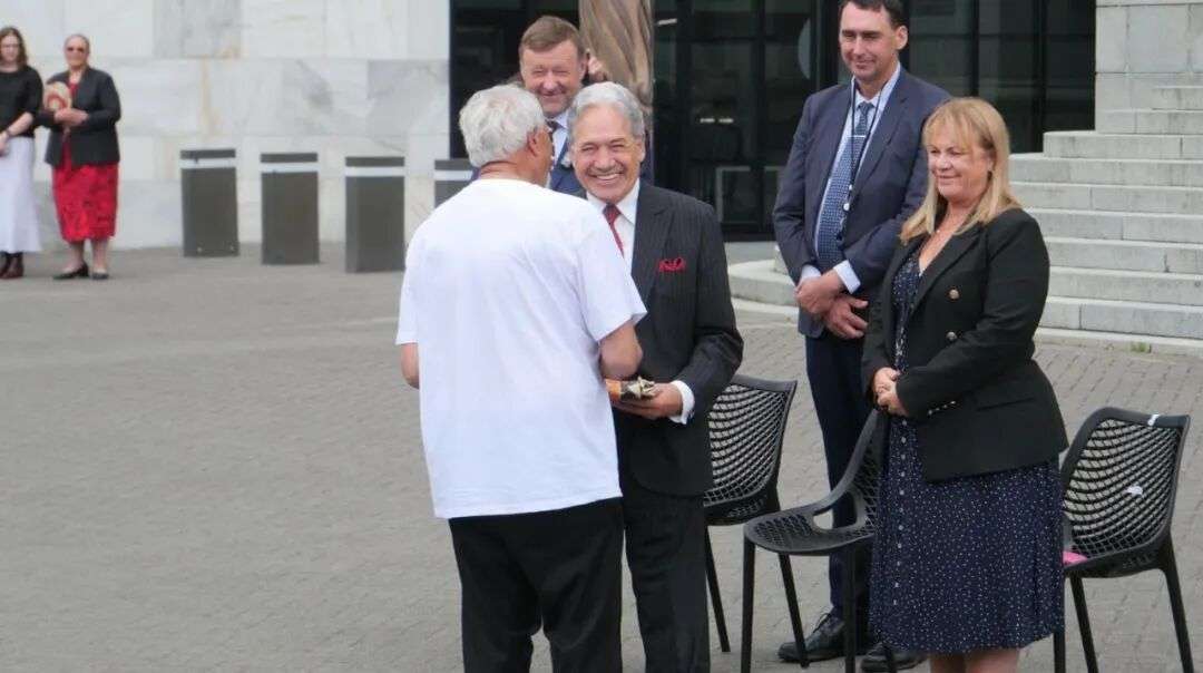 在国会台阶上接过请愿书的,是新西兰优先党党魁、现任外交部长Winston Peters。