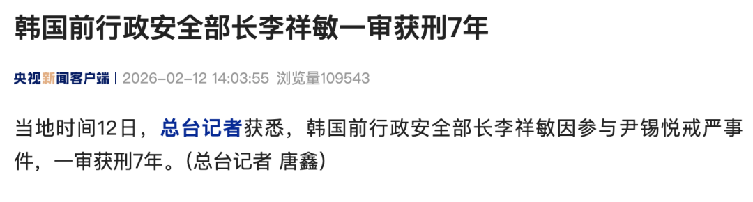 收藏参与尹锡悦戒严事件,韩国前行政安全部长李祥敏一审获刑7年