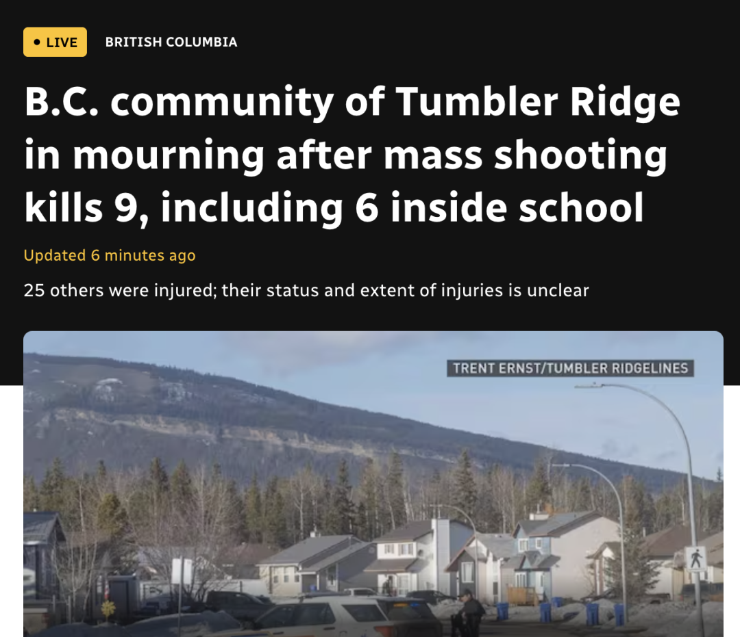 加拿大皇家骑警表示,他们于周二(2月10日)下午1点20分左右接到报警,称东北部小镇图姆布勒里奇(Tumbler Ridge)的Tumbler Ridge中学发生枪击事件。