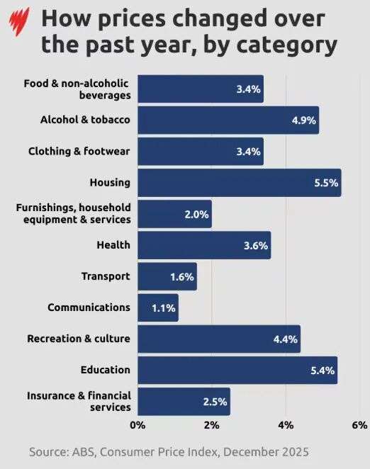 澳大利亚统计局(ABS)最新数据显示,截至 2025 年 12 月季度的一年里,所有家庭的生活成本均出现上升,年度涨幅在 2.3% 至 4.2% 之间。