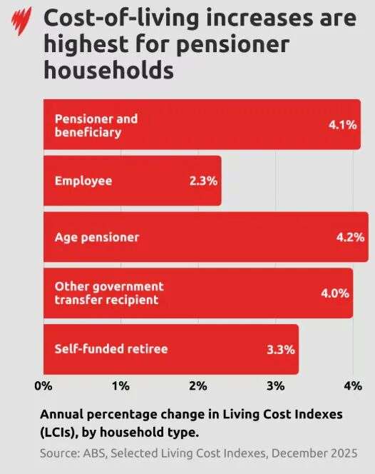 主要依靠政府补贴生活的家庭 —— 包括养老金领取者和各类福利领取者 —— 录得 **4.1% 至 4.2%** 的年度生活成本涨幅,为所有家庭类型中最高。