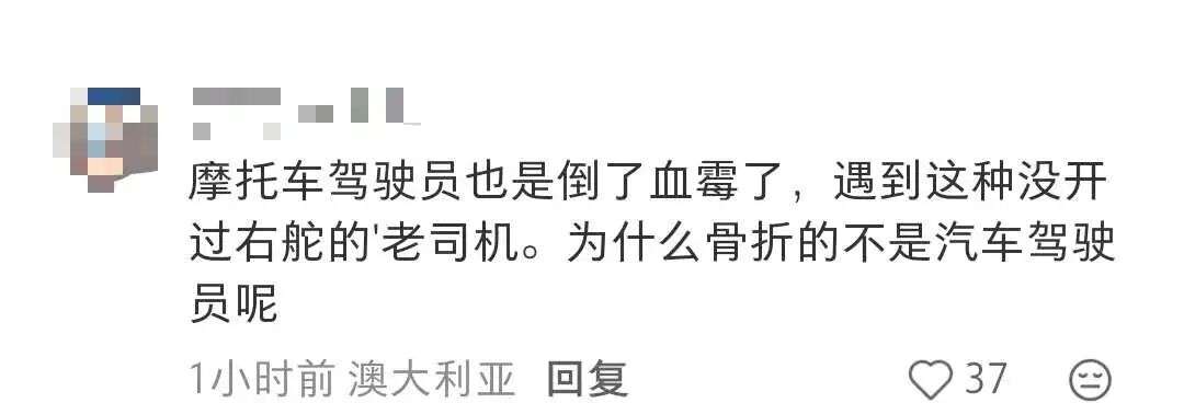 “摩托车驾驶员也是倒了血霉了,遇到这种没开过右舵的'老司机。为什么骨折的不是汽车驾驶员呢”
