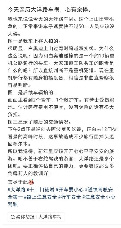 “画面里看到2个警车,1个救护车。有骑士受伤躺地。估计医疗费用不便宜,没有保险的话有很大负担。下午2点正是逆向去阿波罗贝吃饭,正向去12门徒看景的高峰时段。这事故造成不少旅行团掉头返回墨尔本。”
