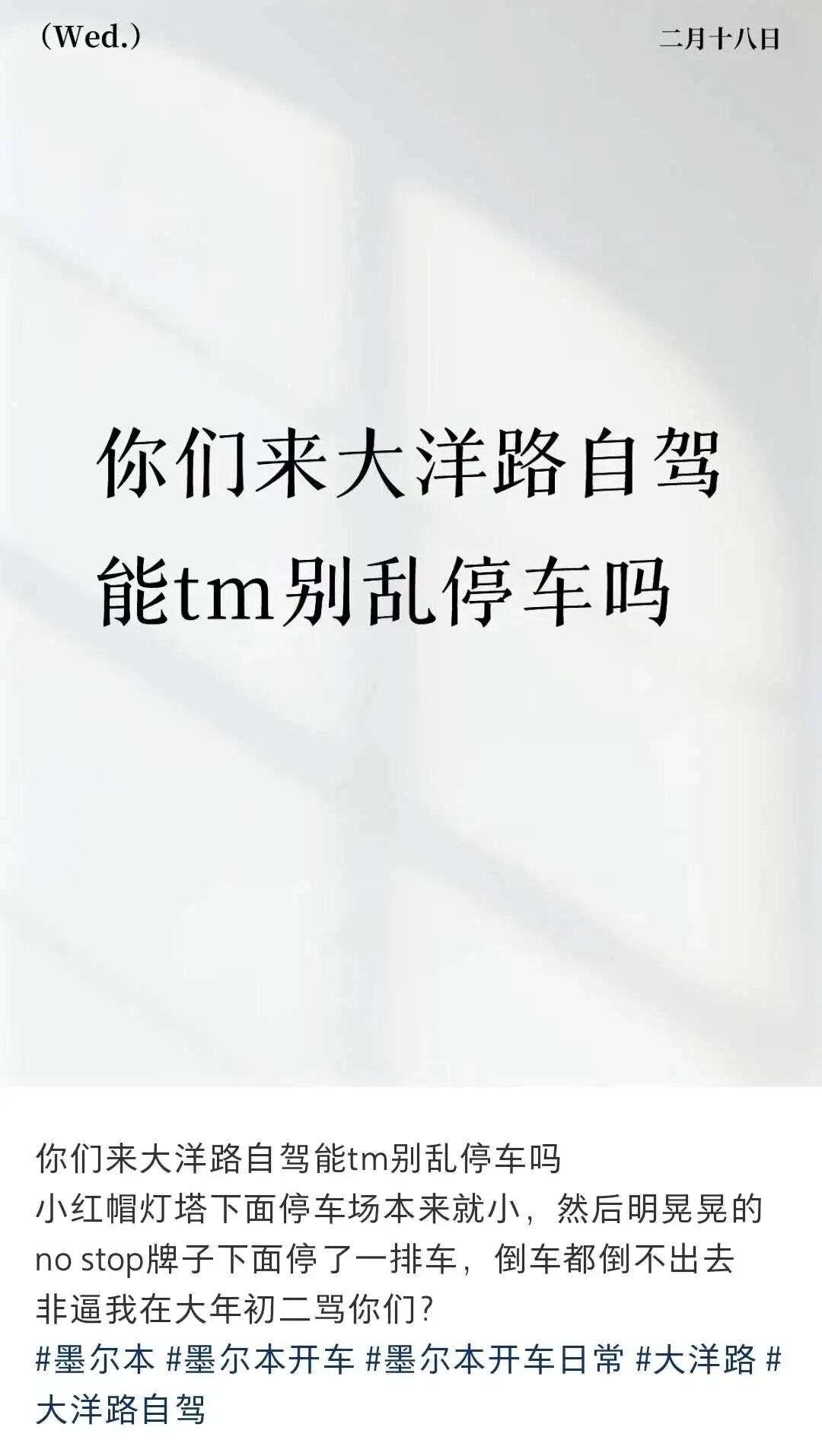 “你们来大洋路自驾能别乱停车吗,小红帽灯塔下面停车场本来就小,然后明晃晃的no stop牌子下面停了一排车,倒车都倒不出去非逼我在大年初二骂你们?”
