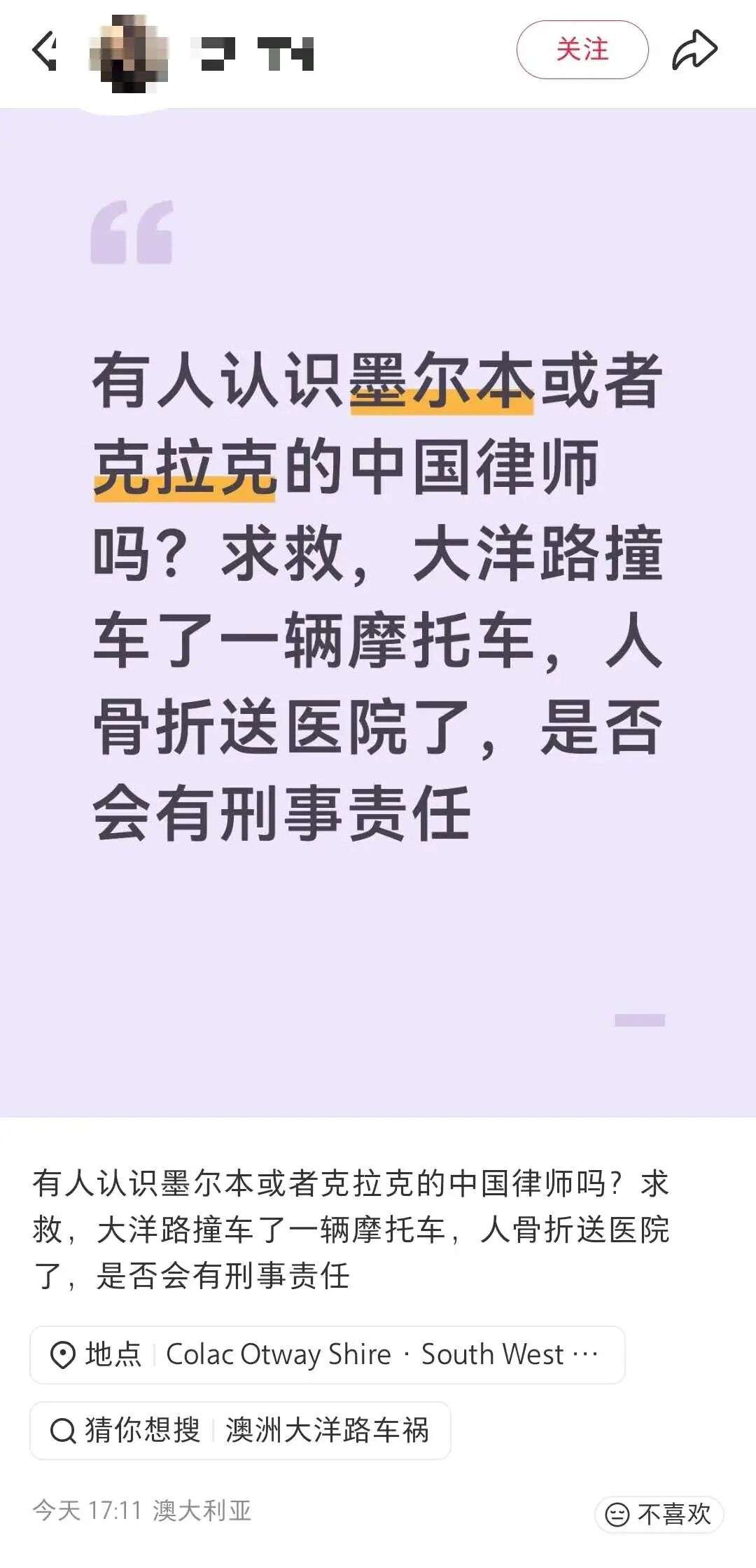 她写道:“有人认识墨尔本或者克拉克的中国律师吗?求救,大洋路撞车了一辆摩托车,人骨折送医院了,是否会有刑事责任”