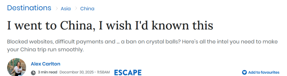 最近就有一位名叫Alex Carlton的澳洲旅行作家写了一篇“经验分享”文章,提醒澳洲人去中国之前应该注意的问题。