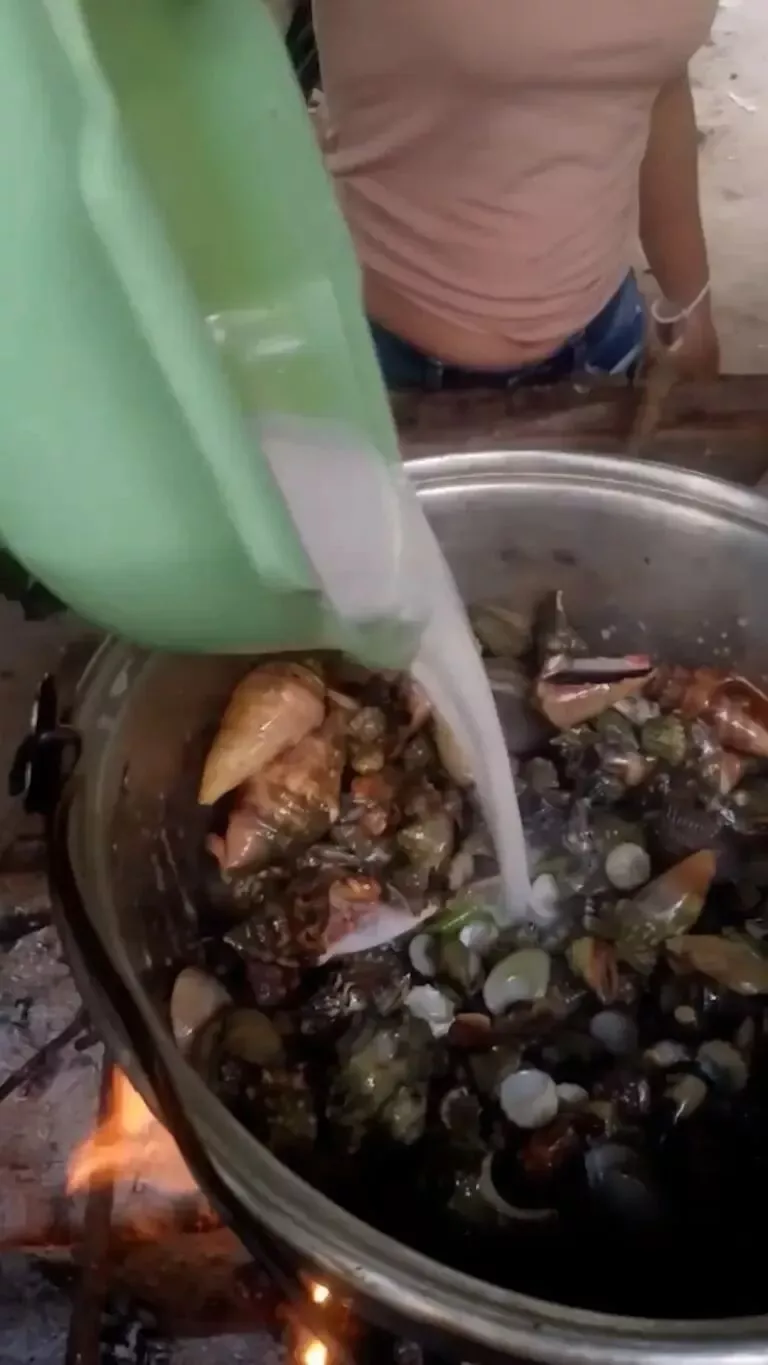 视频中,艾玛兴致勃勃地展示着刚采集的海螺和其他海鲜。她用椰奶将这些海产品煮成一锅丰盛的海鲜大杂烩,然后在镜头前大口品尝。
