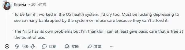 “说实话,如果我在美国医疗体系里工作,我会哭的。看到这么多人因为这个体系破产,或者因为负担不起账单而被拒绝治疗,肯定让人非常沮丧。