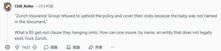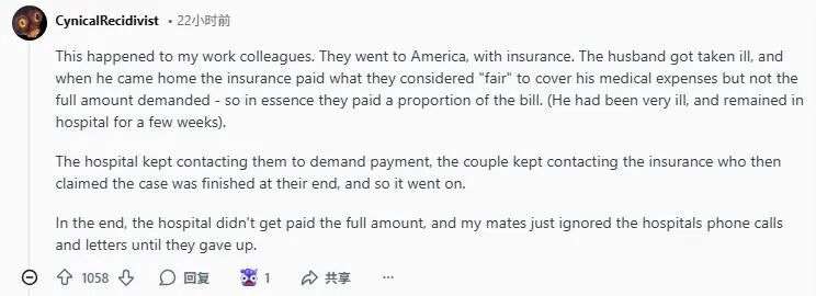 “我同事也遇到过类似的事。他们去了美国,买了保险,丈夫生病了,他回来后,保险公司只支付了他们认为‘合理’的费用——一部分账单,并没有支付全部索赔金额。(他病得很重,住院好几个星期)