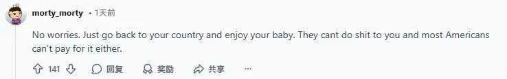 “别担心,你就回你的国家好好享受和宝宝在一起的时光吧。他们拿你没办法,而且大多数美国人也负担不起。”