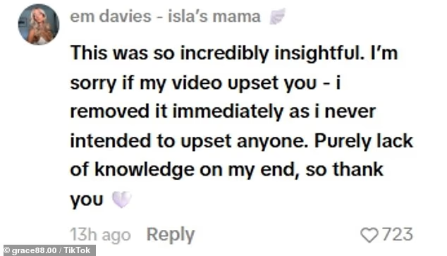 她在一个批评视频的评论区道歉称:“这段视频说的很有道理,如果我的视频让你感到不快,我很抱歉——我立刻删除了视频,我从没想过冒犯任何人。这纯粹是我缺少知识的问题。”