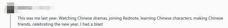 “看中国电视剧,玩小红书,学习汉字,交中国朋友,庆祝新年。我感觉好极了。”