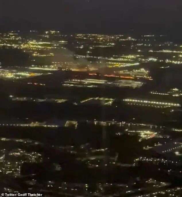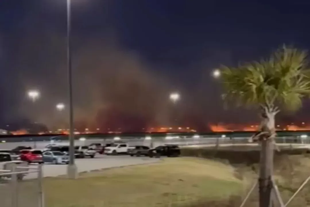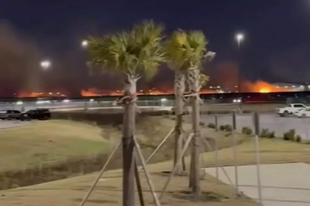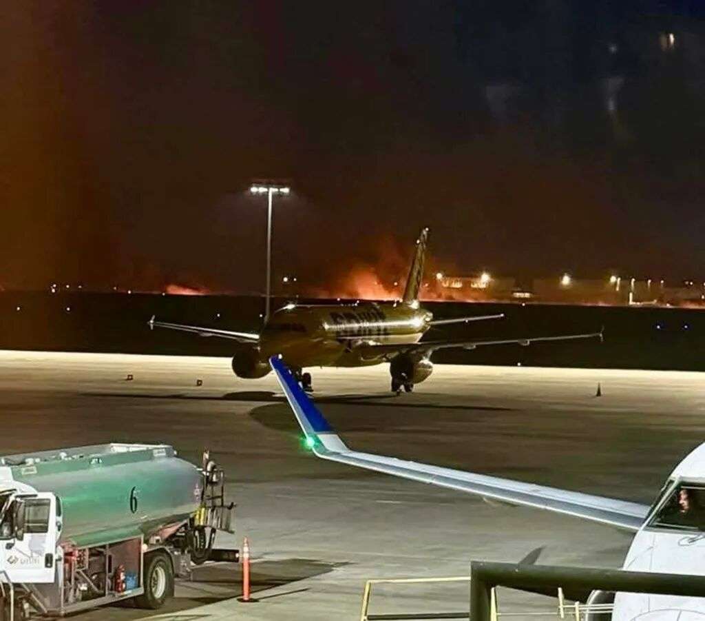 现场画面触目惊心——跑道旁边火墙翻涌,橙色的火光映红了整个地平线。
