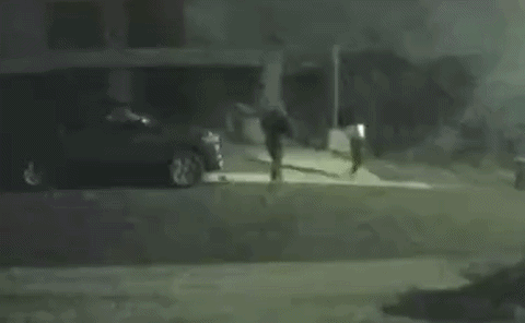 他们从一辆深色SUV下车,走向老人家门口,触发了门前感应灯。