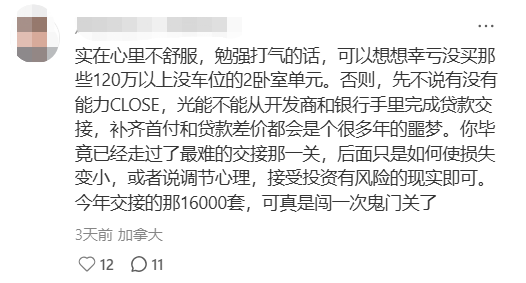 也有较为“专业”的网友分析道:“实在心里不舒服,勉强打气的话,可以想想幸亏没买那些120万以上没车位的2卧室单元。否则,先不说有没有能力交割,光能不能从开发商和银行手里完成贷款交接,补齐首付和贷款差价都会是很多年的噩梦。你毕竟已经走过了最难的交接那一关,后面只是如何使损失变小,或者调节心理,接受投资有风险的现实即可。今年交接的那16000套,可真是闯一次鬼门关了。”