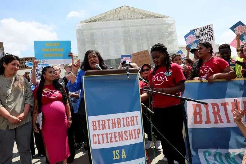 2025年5月15日,美国华盛顿特区,美国最高法院听取有关总统特朗普废除“出生公民权”行政令案件的辩论。抗议者聚集在最高法院外,呼吁阻止特朗普的这项行政命令。东方IC