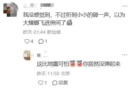 有网友表示没感觉到,但听到了一点响声,以为是大蟑螂飞进来了。