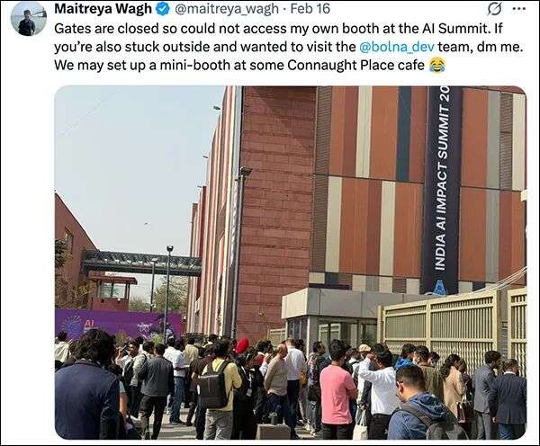 班加罗尔的可穿戴AI初创公司NeoSapien来参展,创始人亚达夫发帖子说,他们本来准备轮流吃午饭,有人守展台,但安保人员要求所有人都得离开,因为总理莫迪下午到场,安保要清场安检,展商的展品无需带走,“此处是高级别安保区”,绝对安全,随后便锁了门。