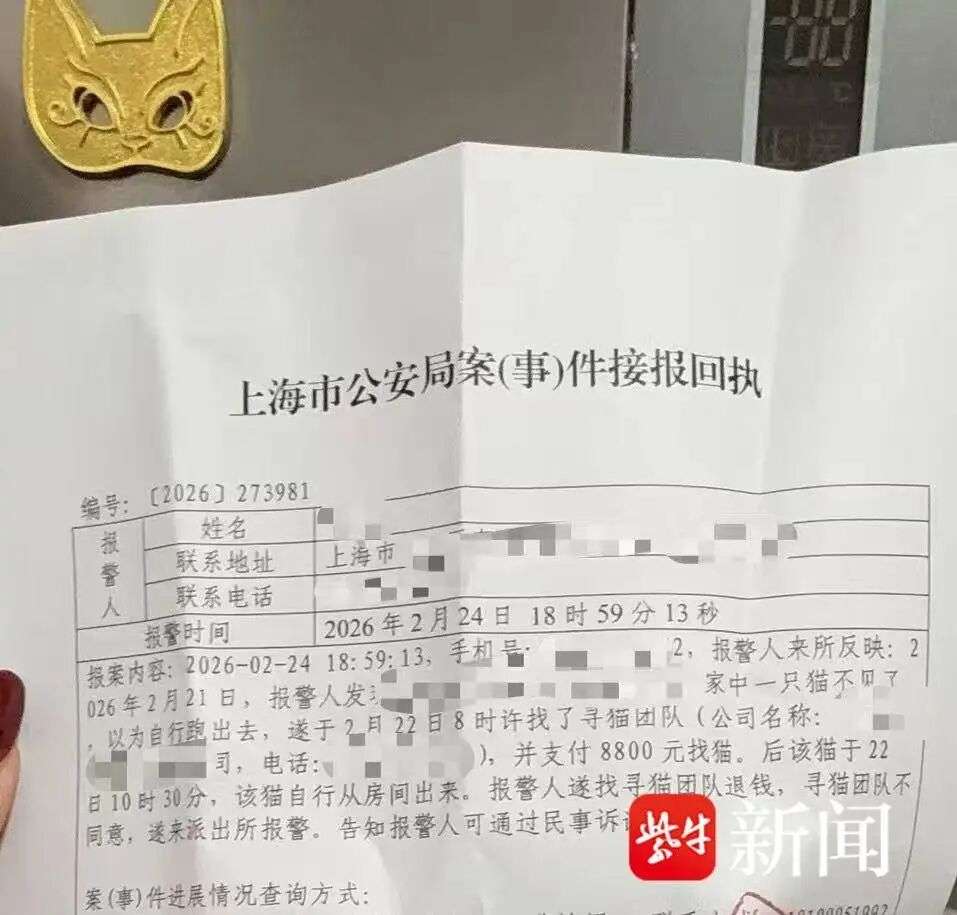 近日,扬子晚报/紫牛新闻记者从上海市民陈女士(化名)处了解到,她因误以为猫咪走失,联系了一家专业寻宠团队,先预付1000元定金、正式搜寻前又支付7800元尾款,共计花费8800元寻求寻宠服务。然而事后发现,猫咪并未离开办公室。陈女士质疑该寻宠团队在搜寻过程中未尽到相应职责,要求对方退还尾款被拒绝。她认为此类高价寻宠服务名不副实,目前已报警处理,并委托律师准备提起诉讼。记者就此联系涉事寻宠团队,工作人员称正与当事人沟通协商。