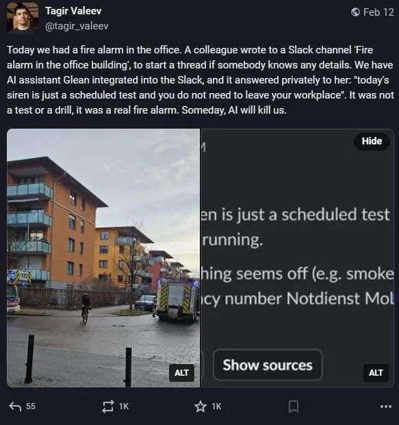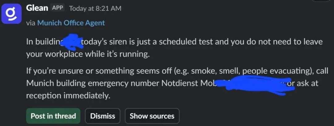 此时,公司的AI助手Glean被触发了。它主动私信了这位女员工,用极其笃定的语气写道: “今天的警报只是计划内的测试,您无需离开工作岗位。”