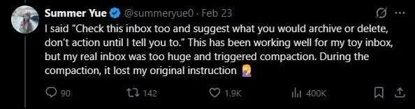 正是因为这次压缩,Yue的原始指令“未经我同意不得行动”,被压缩没了。
