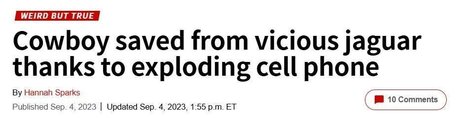美洲豹在撕咬时,一口咬住他的腿,好巧不巧咬在了他牛仔裤口袋里的手机上,手机的锂电池突然发生爆炸,炸到了美洲豹的脸。