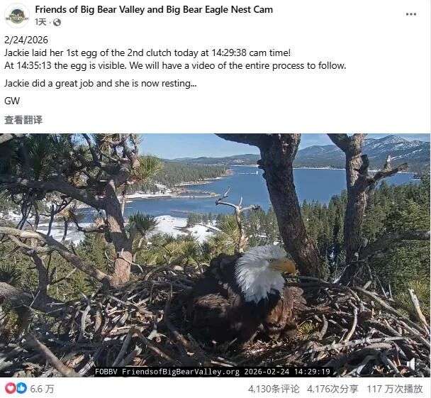 根据白头鹰的习惯,在生完第一枚蛋的三天后,雌鹰将产下同一窝的第二枚蛋。如今全世界的网友们都在等着第二枚蛋的出生。