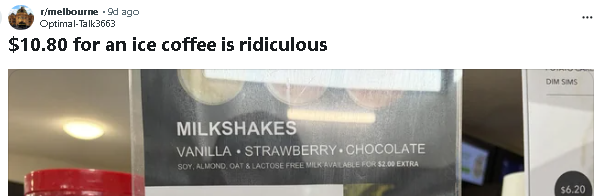 事情是这样的——一位本地顾客把这家店的菜单发到了网上。上面显示,一杯普通的冰咖啡或冰巧克力(配普通牛奶),要价 10.80澳元。