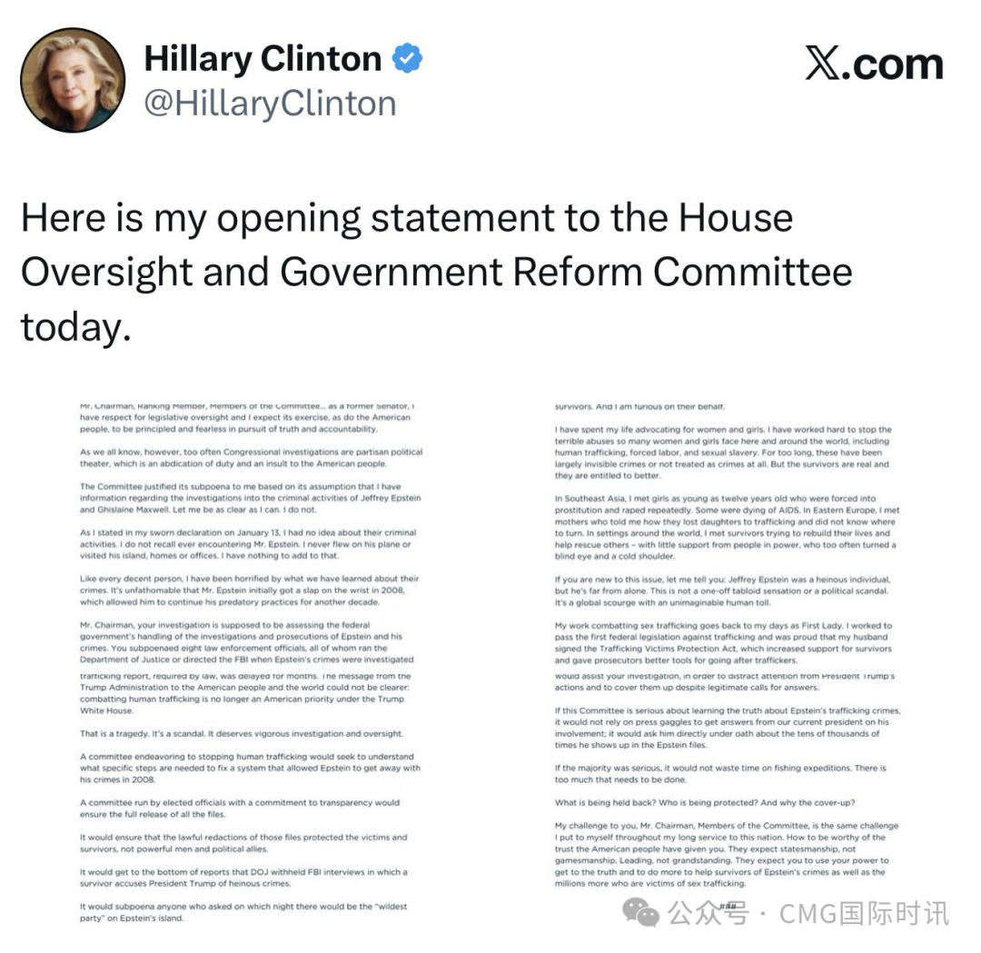 希拉里指责由共和党主导的众议院监督与政府改革委员会试图转移人们对特朗普总统与爱泼斯坦关系的关注,并要求国会对特朗普直接展开问询。